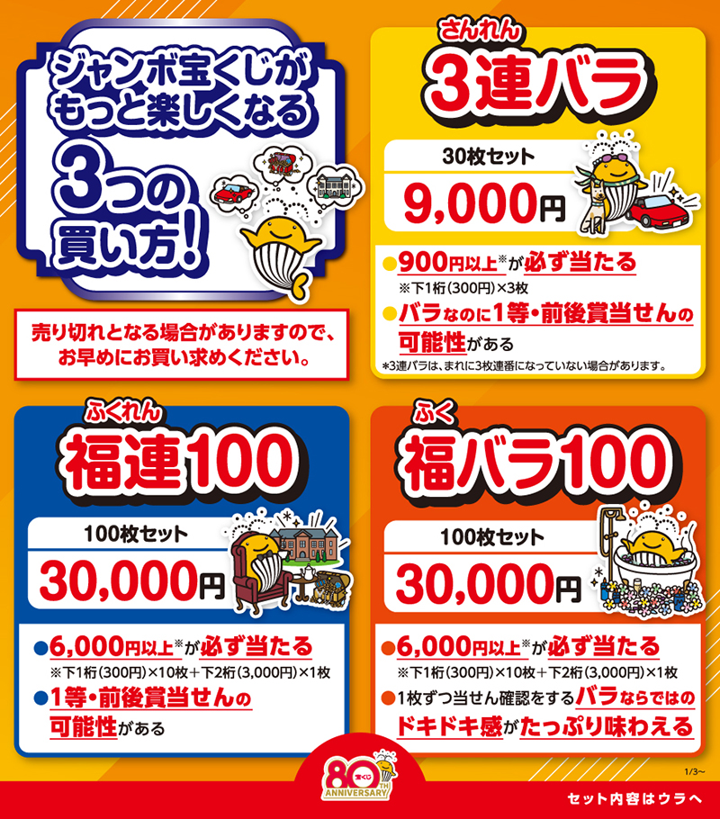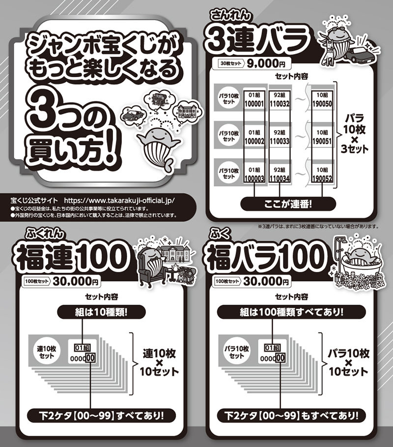 01組~100組まで揃った100枚セットを、種類を変えて10セット合わせた1000枚で、下3桁の数字が000~999まで揃っています。(組と番号がバラバラな宝くじを1000枚ご用意しています)